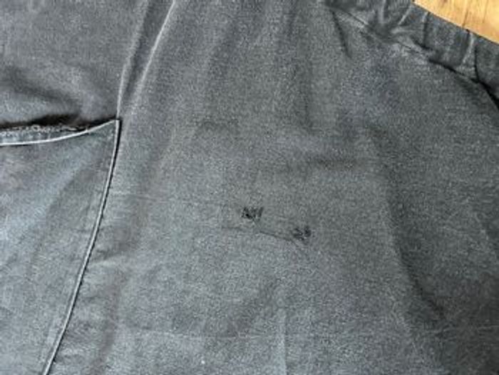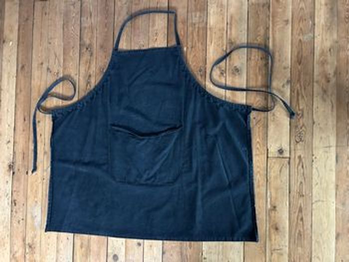 Grand tablier noir avec poche 2 trous visibles sur photo Couleur passée Largeur en bas 110 cm Longueur avec la bavette 93 cm