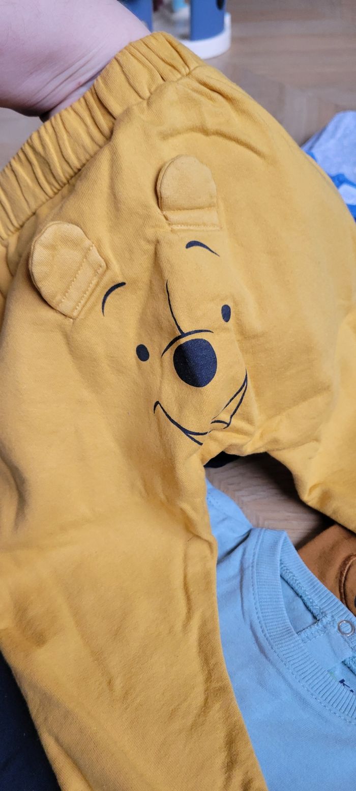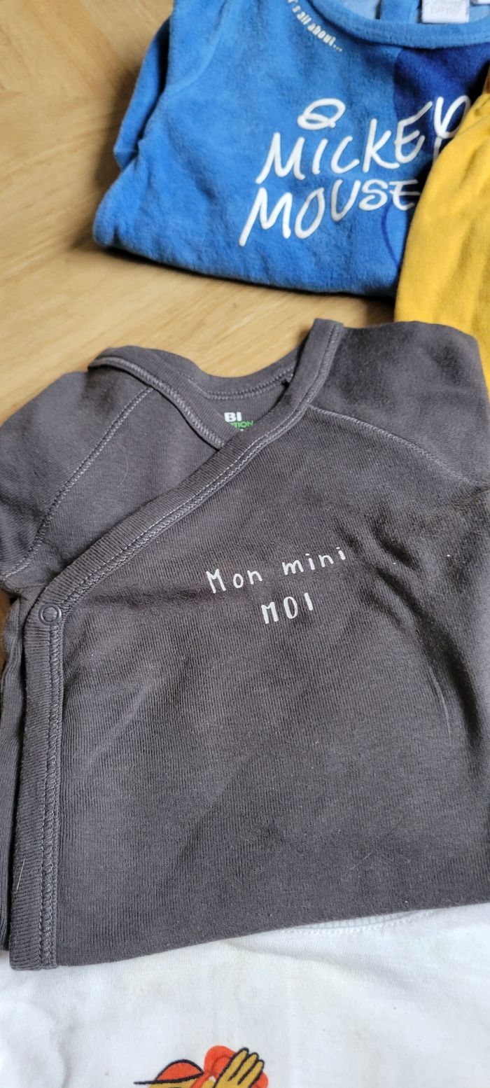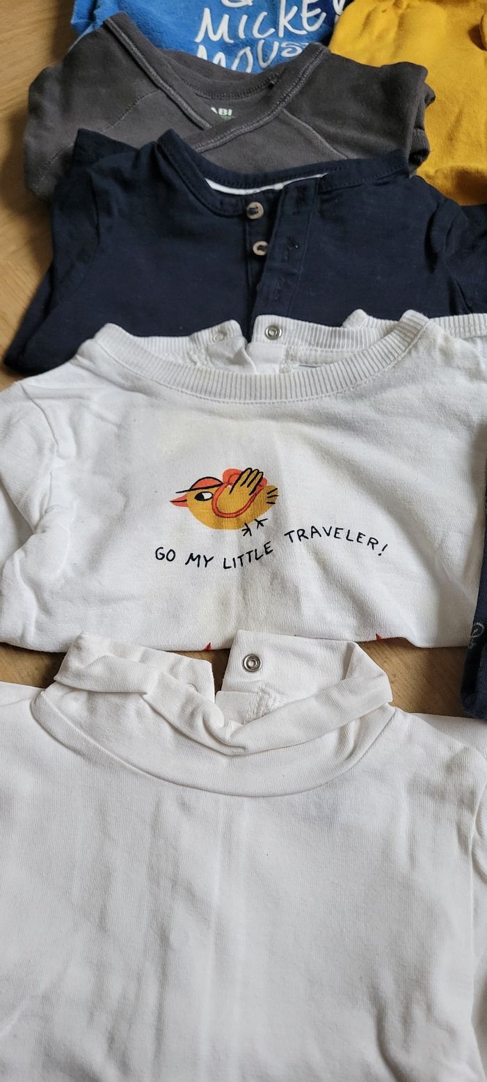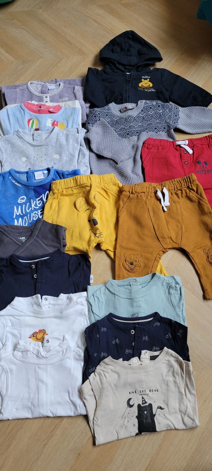 Bonjour, Je revends ce lot de vêtements plutôt orienté garçon, taille 6 mois Les vêtements sont plutôt en tbe, des auréoles visibles sur un dds t-shirts (cf photos) Il se compose de : 3 sarrouels molletonnés Disney 1 gilet veste zippé à capuche winnie l'ourson 1 pull 6 t-shirts manches longues 1 bodie croisé 4 pyjamas velours Beaucoup de disney et kiabi