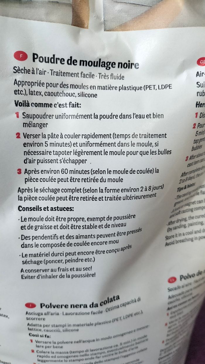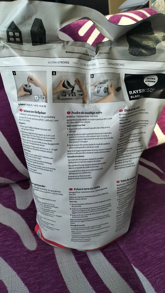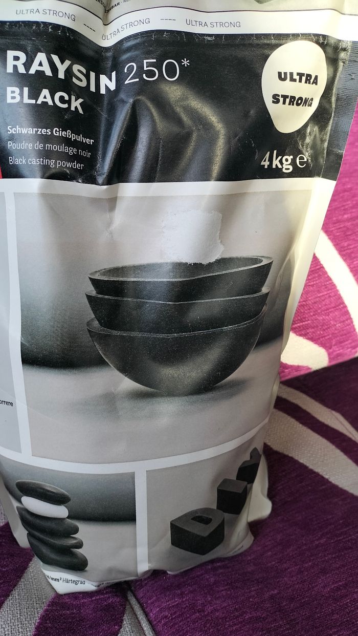 Sac de 4 kg de poudre de moulage noire 250 Raysin pour loisirs créatifs Marque Rayher Facile à utiliser Sèche à l'air Utilisable dans moules en latex caoutchouc silicone plastique 15€ l'unité possibilité d' en acheter plusieurs