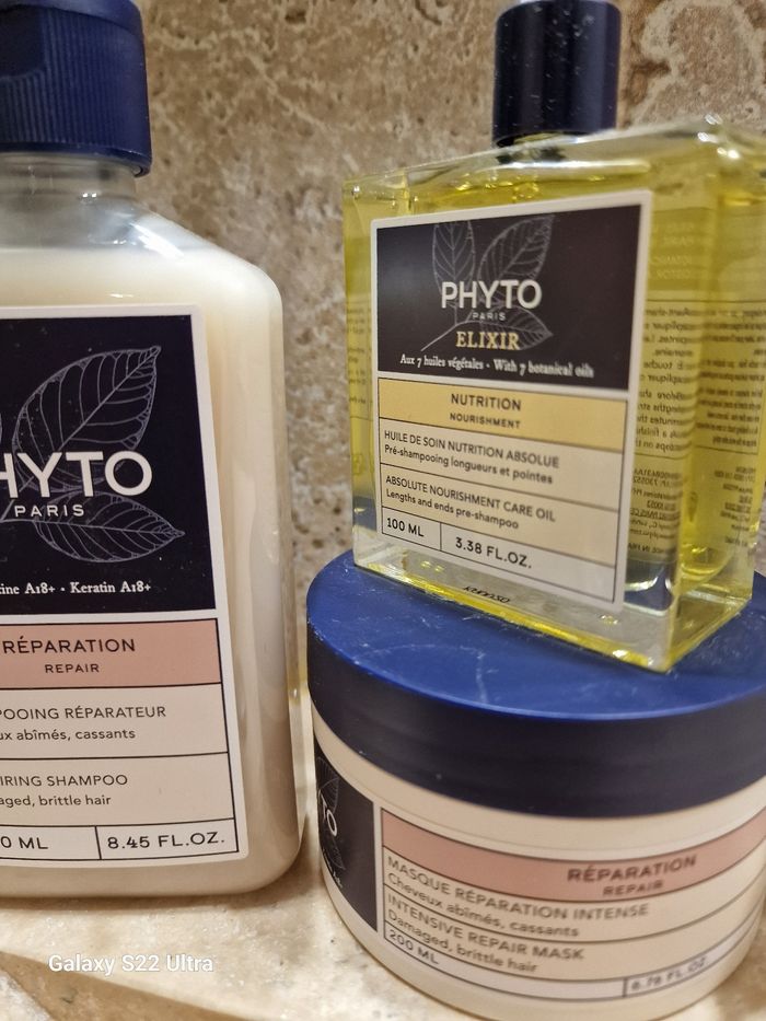 Marque phyto. Shampoing 250 ml plus elixir 100ml plus masque réparateur 200ml