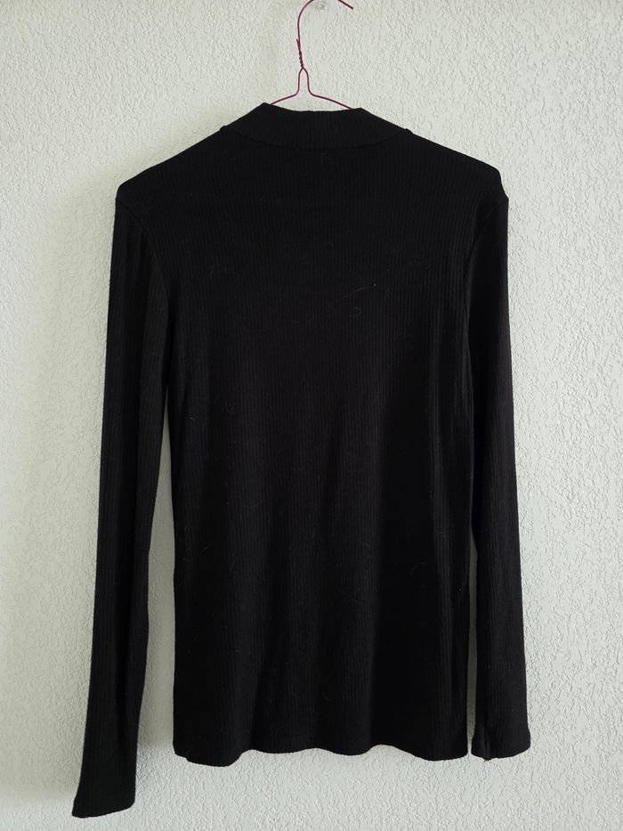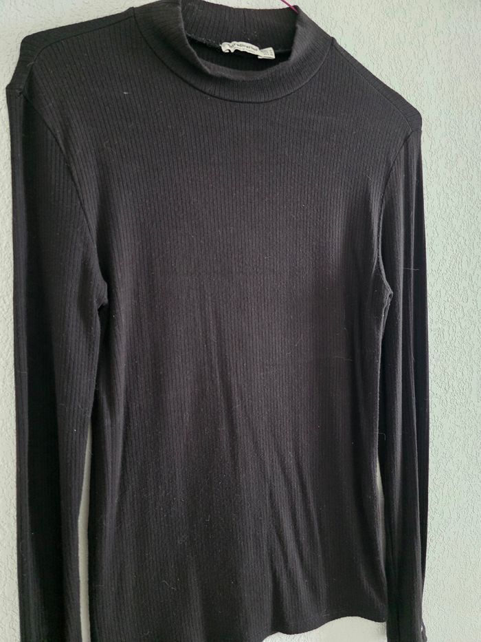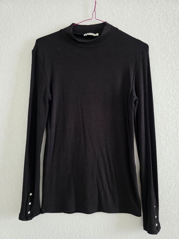 Pull noir moulant côtelé, boutons décoratifs aux poignets, bon etat général mais défaut sur lavant du au pliage. Taille m, stradivarius.
