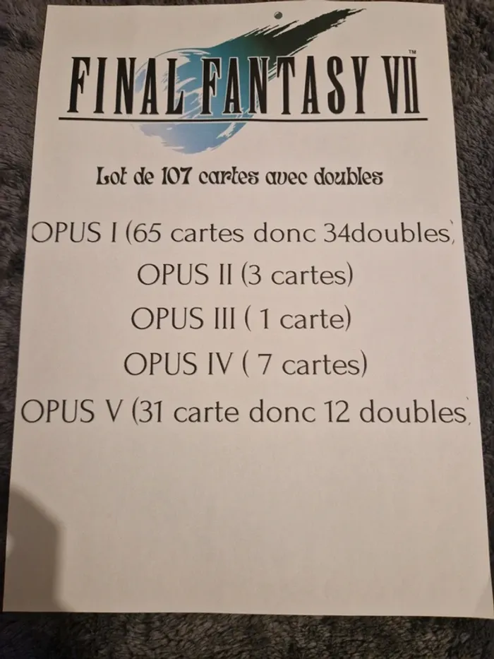 Vend lot de 107 cartes final fantasy En très bon état Lot détaillé en photo Envoi rapide et super bien protéger Pour plus de renseignements ou photo je reste a votre disposition