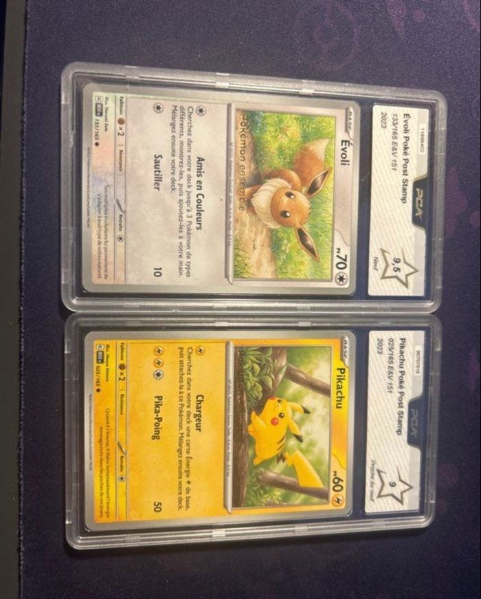 lot de 2 cartes Pokémon gradées PCA, issues de la série Pokémon Écarlate & Violet EV3.5. 📌 Détails des cartes : • Évoli – EV3.5 • Carte Reverse avec tampon « Post Stamp » • Gradation PCA 9.5 • État exceptionnel, proche du Gem Mint • Pikachu – EV3.5 • Carte Reverse avec tampon « Post Stamp » • Gradation PCA 9 • Très belle conservation Ces deux cartes mettent en avant des Pokémon emblématiques dans une série très appréciée, avec un tampon spécial EV3.5, recherché par les collectionneurs. Boîtiers PCA scellés, idéals pour collection ou investissement. 💶 Vente uniquement 📍 Remise en main propre ou envoi soigné possible