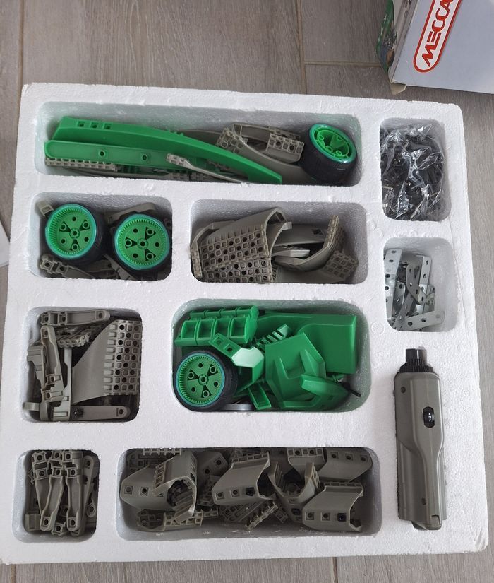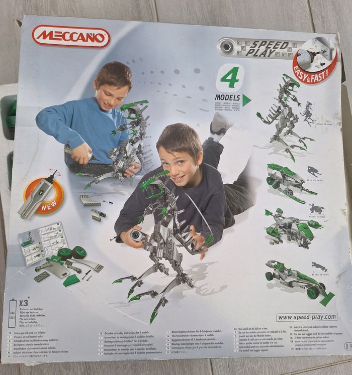 Coffret Meccano speed play 8901 Dans la boîte d origine avec la notice de montage pour créer 4 modèles Le tournevis électrique qui sert aussi de moteur fonctionne parfaitement Les 4 pneus sont collés sur les jantes Prêt a l emploi