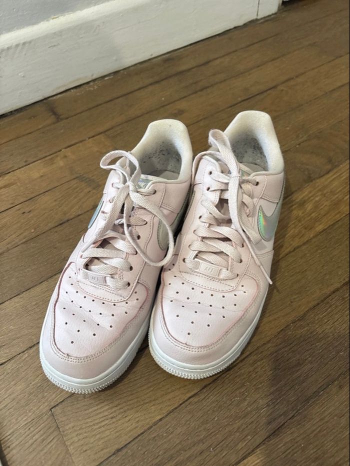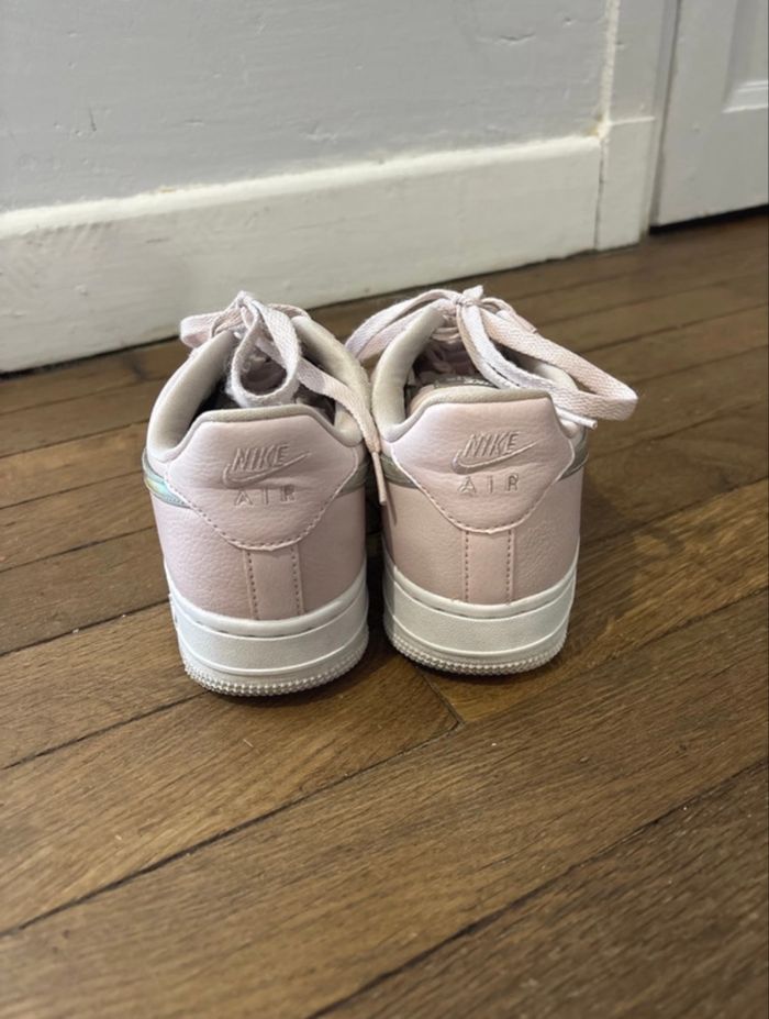Air force en très bon état ( bouloches au niveau du talon dans les chaussures causé par le frottement des chaussettes) -> voir photo. Porté quelques fois Couleur rose avec logo à reflets sur les côtés Marque Nike Taille 38