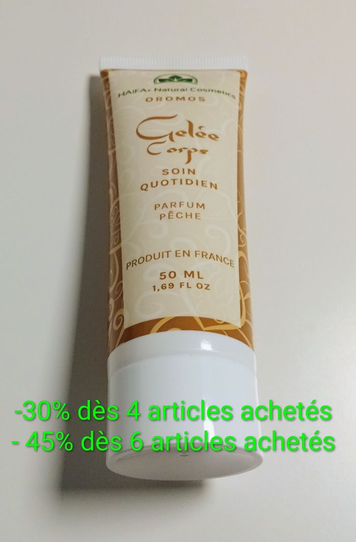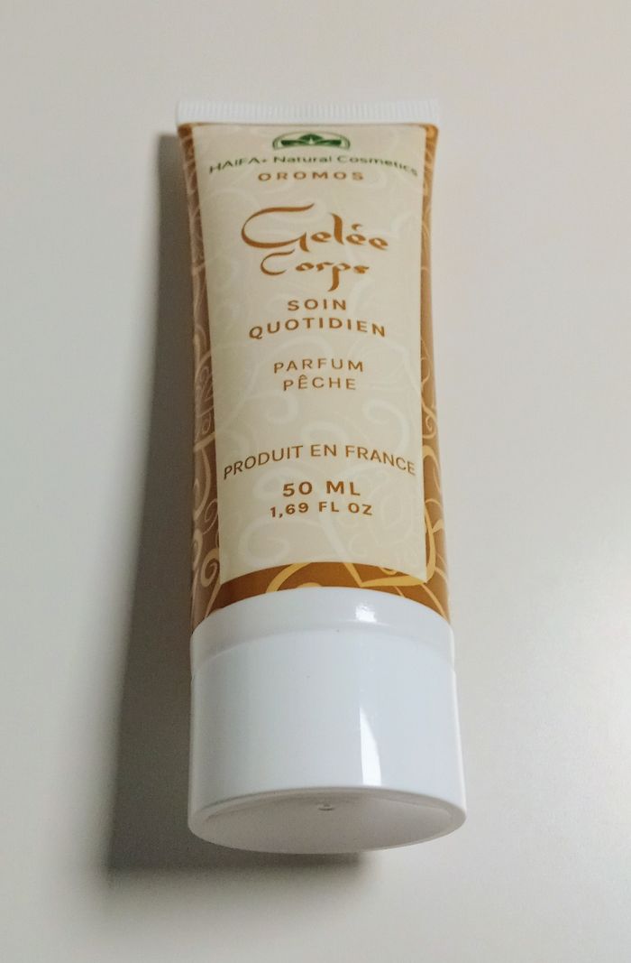 Gelée corps Neuve - Marque Haifa - Parfum pêche - 50ML. Prix en boutique : 15,90€ Cette gelée corps à la texture gel, associe les bienfaits de la pomme et de l'acide hyaluronique pour prendre soin de votre peau au quotidien. Laissez-vous envoûter par son délicieux parfum de pêche. 99,2% d'ingrédients d'origine naturelle. Appliquez la gelée sur votre corps. Attendre quelques secondes jusqu'à absorption complète. Fabriquée en France.