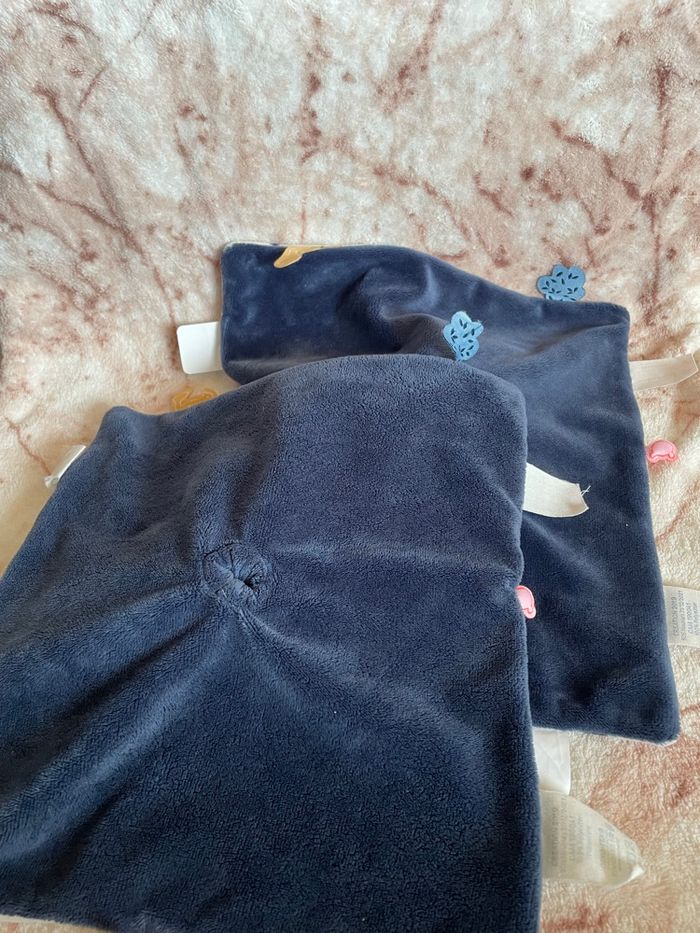 Doudou plat Aston chien dalmatiens blanc à pois bleu marine Au dos uni bleu marine Attache tétine bleu rayé blanc Collection: Aston & Jack +/- 28cm Noukie’s Occasion en excellent état Vous achetez le doudou que vous voyez sur la photo Lot de 2 doudous