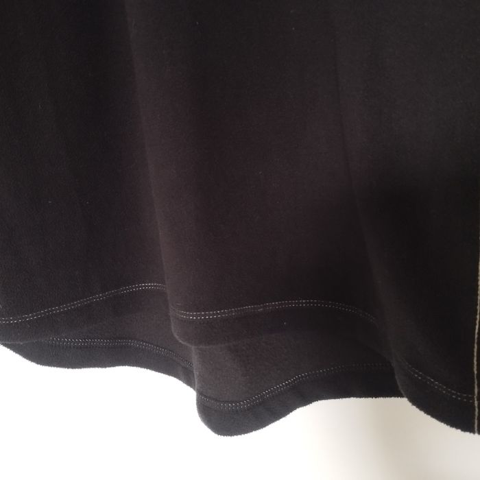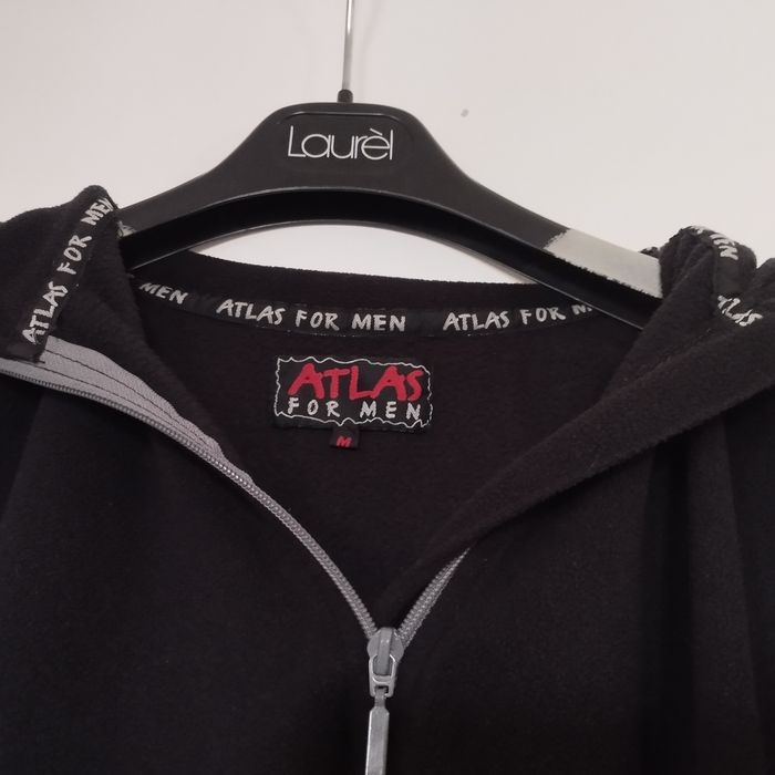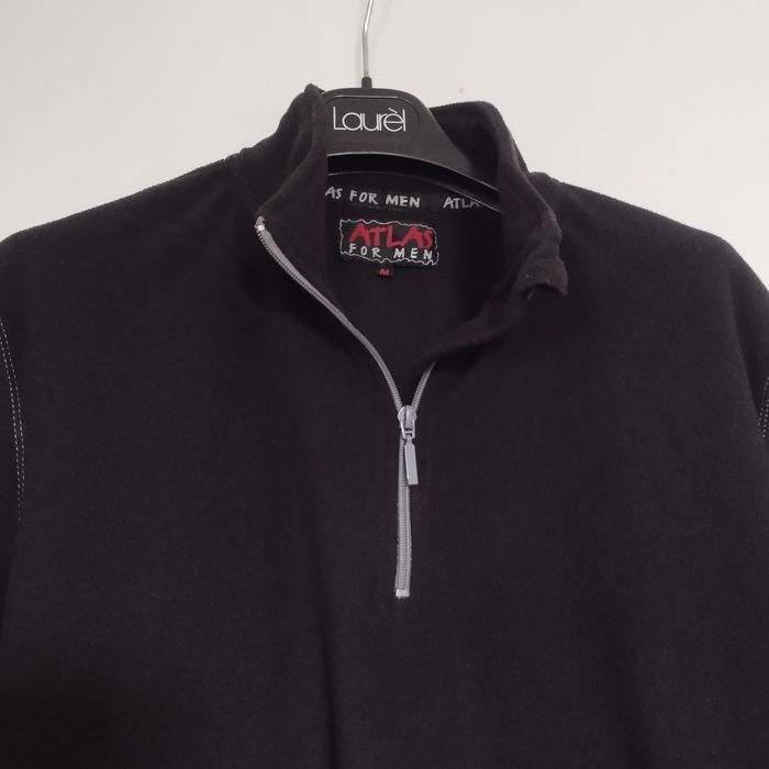 Pull sweat polaire homme de Atlas for Men, fermeture zippée, coloris noir et 2 bandes de chaque côté brodé au fil bleu blanc rouge, il a une forme plus long à l'arrière. Devant 65cm de hauteur, arrière 74cm. Aisselle à Aisselle 56cm.