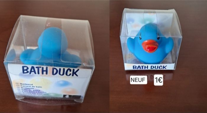 Boîte à goûter + 3 assiettes en plastique + 2 cuillères + ensemble pour la plage + petit canard bleu pour le bain. Tout est NEUF. Voir détails sur les photos