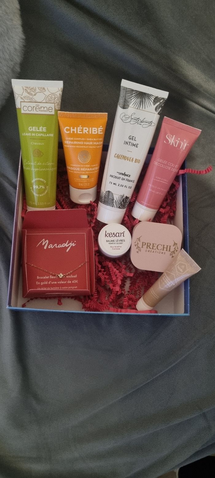Lot de produits de beauté 🥰 Gelée cheveux (Corème Paris) Gel intime (Sweety beauty) Masque reparateur (Chéribé) Gelée cou et décolleté doré (Skin'r) Highlighter et ombre à paupières pailleté (Exaalta) Baume lèvres (Kesari) Bougie (Prechi) Bracelet (Maradji) Pour un total de 80€ au lieu de 211,15€ prix d'origine. Idéal pour offrir ou se faire plaisir soi-même 😊