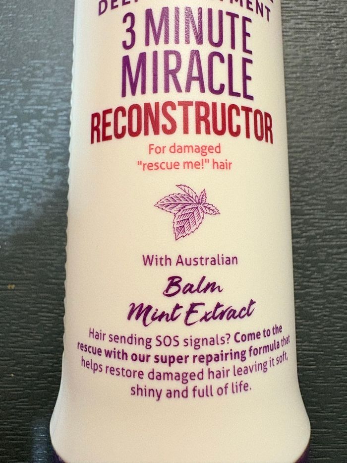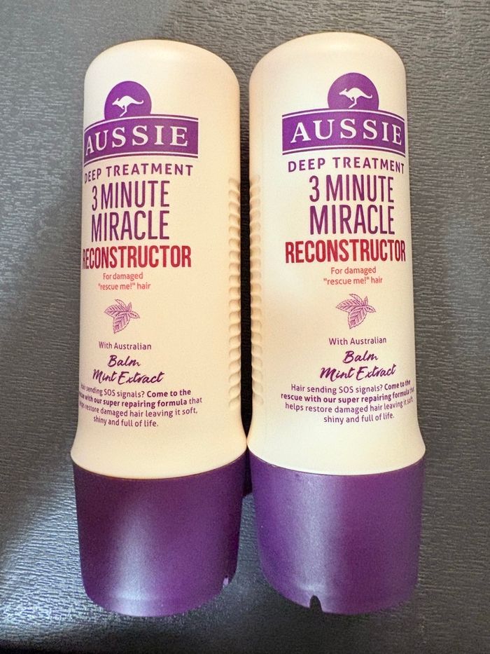 Je vends ce lot de deux flacons de soin intensif Aussie "3 Minute Miracle Reconstructor" (250 ml chacun). C'est le produit culte pour sauver les cheveux secs ou abîmés en un temps record ! • État : Neufs (jamais utilisés) • Action : Reconstruit la fibre capillaire, apporte douceur et brillance. • Ingrédient clé : Extrait de Mélisse Citronnée d’Australie (Balm Mint). • Format : 2 x 250 ml (Pratique avec le bouchon vers le bas, pas besoin de dévisser). Parfait pour une cure de réparation intense ou pour faire votre stock !
