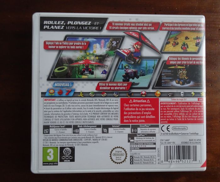 Brûlez l'asphalte, planez dans les airs et plongez sous l'eau dans Mario Kart 7 sur les consoles de la famille Nintendo 3DS! Dès 3 ans. Jeu complet en très bon état, avec boite et notice. J’ai d’autres jeux de DS dans mes annonces, pour économiser sur les frais de port.