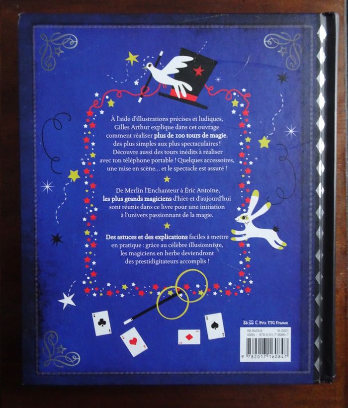 À l'aide d'illustrations précises et ludiques, Gilles Arthur explique aux enfants comment réaliser plus de 100 tours de magie, des plus simples aux plus spectaculaires, des tours dignes des plus grands prestidigitateurs du monde! Et même des tours à réaliser avec un téléphone portable! Un ouvrage très complet qui propose, outre les tours, des trucs et astuces, une histoire de la magie revue et complétée, et de nouveaux portraits de magiciens célèbres. Voici LE livre de la magie pour les enfants d'aujourd'hui! La couverture a été scotchée en bas à droite du livre. Des légères traces sur la tranche du livre.