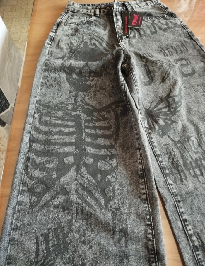 Grunge Punk jeans à jambes larges. Imprimés squelettes pour femme. Taille S. Neuf, avec étiquettes et emballé.