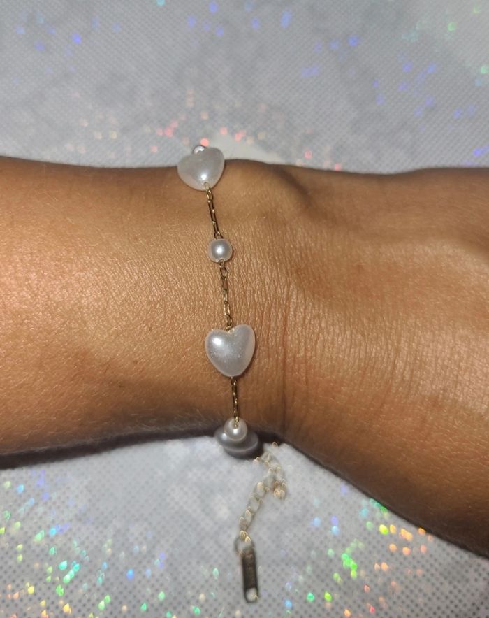 Très joli bracelet en acier inoxydable doré avec coeur nacré Longue réglable de 17 à 21 cm