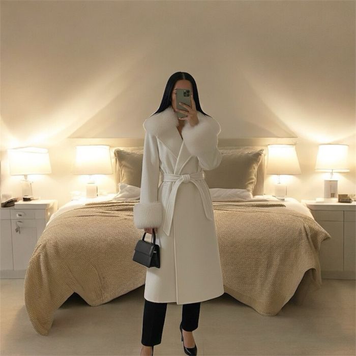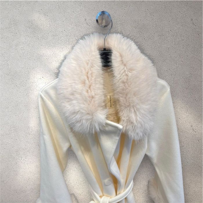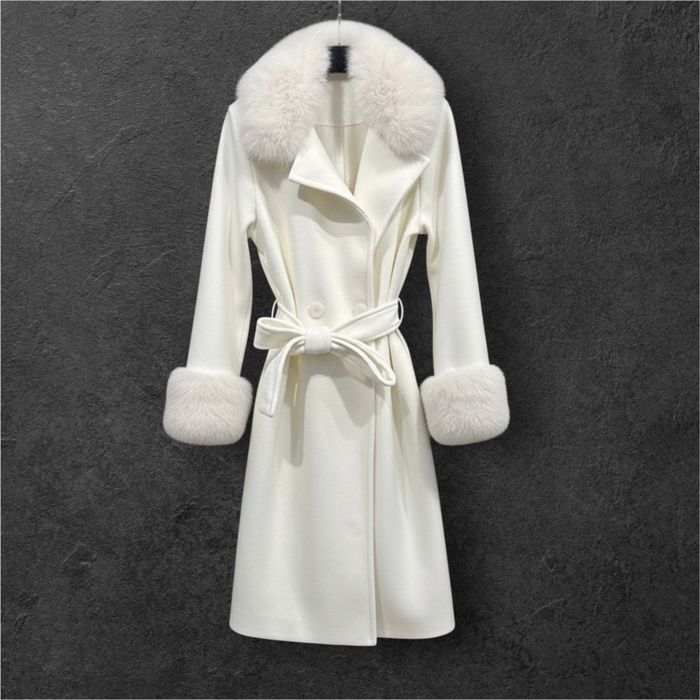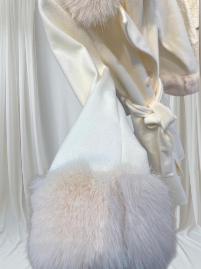 Long manteau à fourrure blanche sur les manches et sur le col Taille unique Dimension : entre les épaules=45 cm Manche avec fourrure=60 cm Tour de taille = 53 cm Longueur = 1m20 Photo supplémentaire sur demande Disponible en noir et en blanc