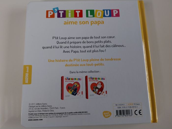 📘 P’tit Loup aime son Papa Un joli album jeunesse tendre et rassurant, idéal pour partager un moment de complicité entre parent et enfant ❤️ À travers une histoire douce et illustrée, P’tit Loup exprime tout l’amour qu’il porte à son papa. Un livre parfait pour aborder les émotions, l’attachement et la famille avec les tout-petits. ✨ Points forts : • 📚 Album jeunesse très apprécié • 💙 Thème de l’amour parent-enfant • 👶 Adapté dès le plus jeune âge • 🎨 Illustrations colorées et attrayantes • 📖 Format idéal pour la lecture du soir 📦 État : parfait état Livre propre, pages intactes, aucune annotation. 🏡 Maison non fumeur 🚚 Envoi rapide et soigné 📦 Possibilité de lot pour réduire les frais de port 🎁 Une belle idée cadeau pour les enfants et leurs papas 🥰