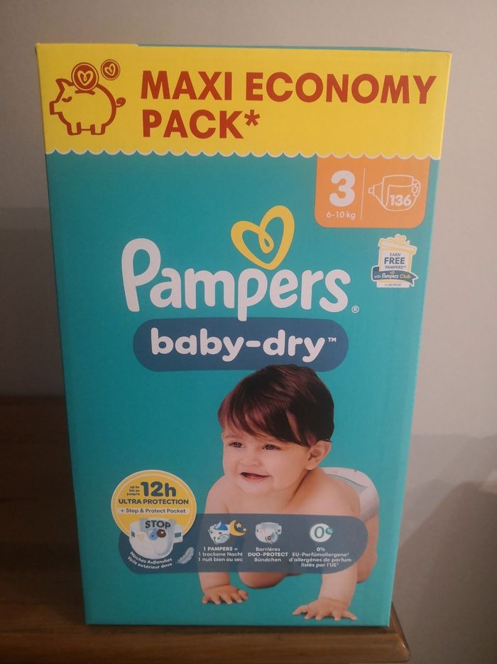 Couche pampers baby dry stop&protect taille 3 6-10kg, 136 couches, emballage neuf envoi rapide et soigné.