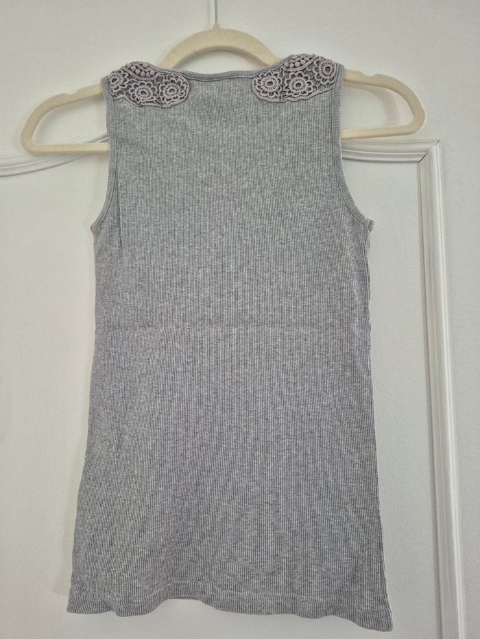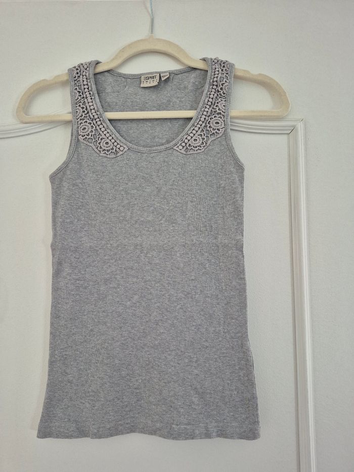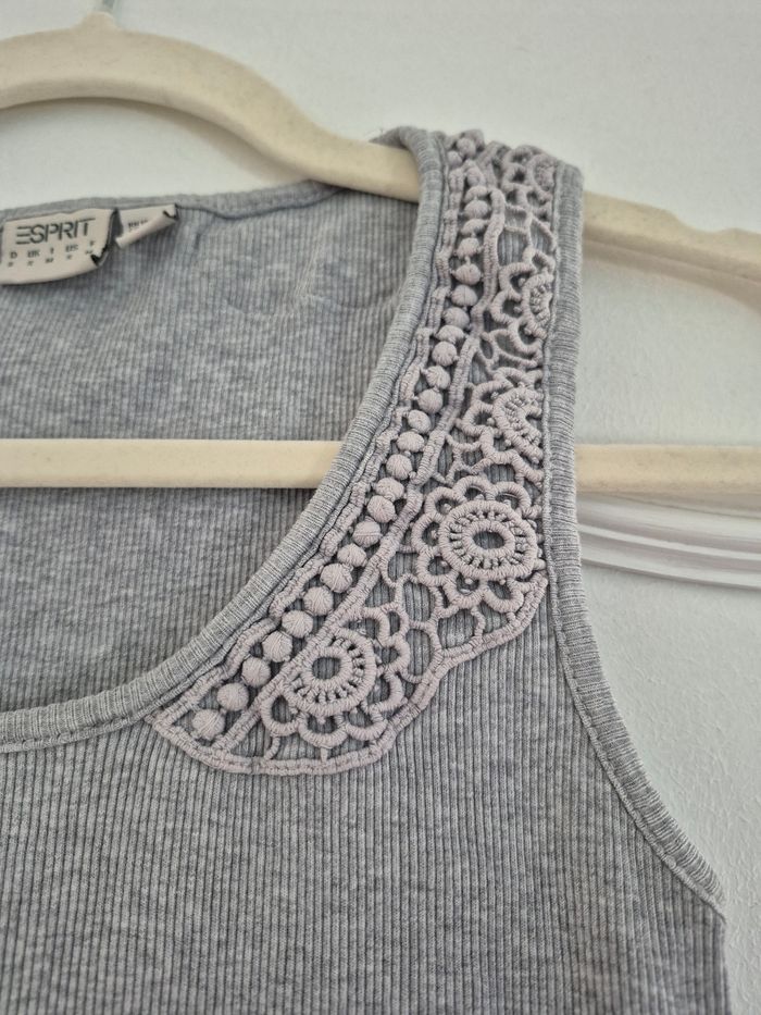 Débardeur femme, matière cotelée, avec jolis empiécements dentelle/broderie/crochet. En très bon état.
