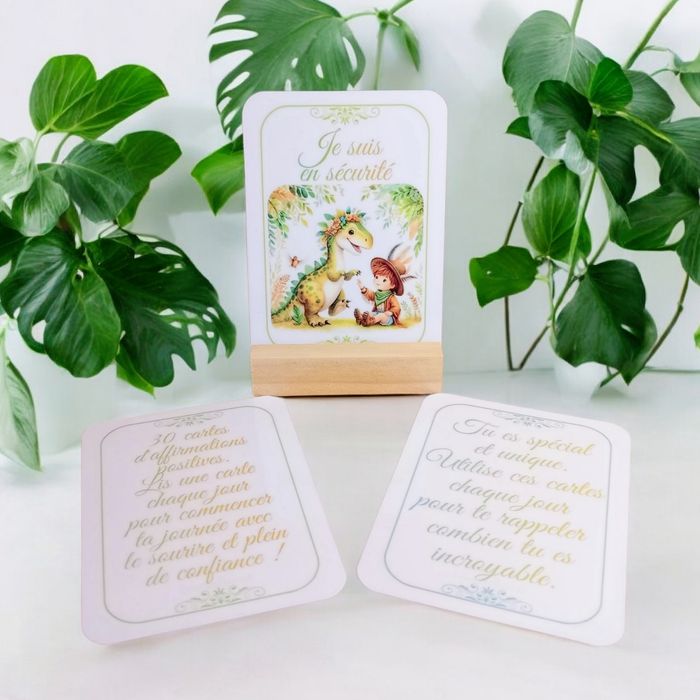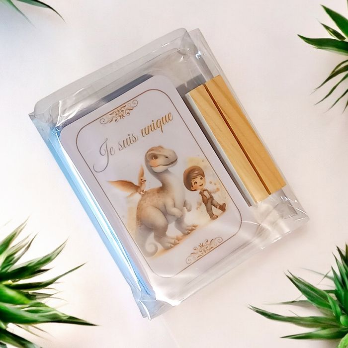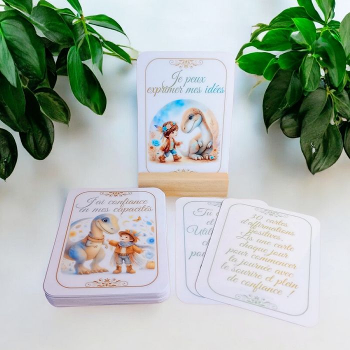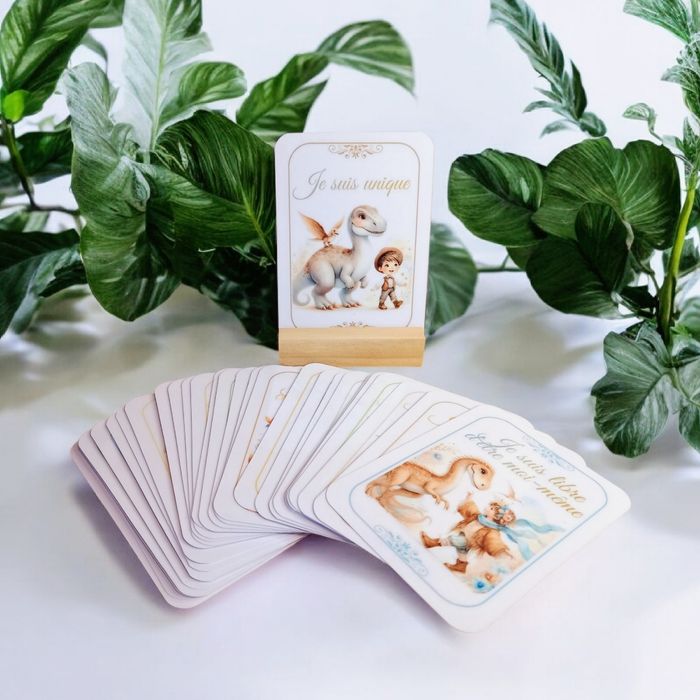 Plongez dans un univers magique avec ce lot de 30 cartes d'affirmations sur le thème des dinosaures, spécialement conçu pour les garçons. Chaque carte, magnifiquement illustrée et écrite au masculin, est une source quotidienne d'inspiration et de positivité. Ce lot comprend : - 30 cartes d'affirmations laminées pour une durabilité maximale, garantissant qu'elles restent impeccables, même après des manipulations répétées. - Un support en bois élégant, parfait pour afficher la carte du jour et garder l'affirmation positive à l'esprit tout au long de la journée. " Chaque matin, choisis une carte au hasard, place-la sur le support en bois et laisse-toi imprégner par la force des affirmations positives ". Ce lot est plus qu'un simple jeu, c'est un outil puissant pour cultiver la confiance en soi, l'optimisme et la joie.