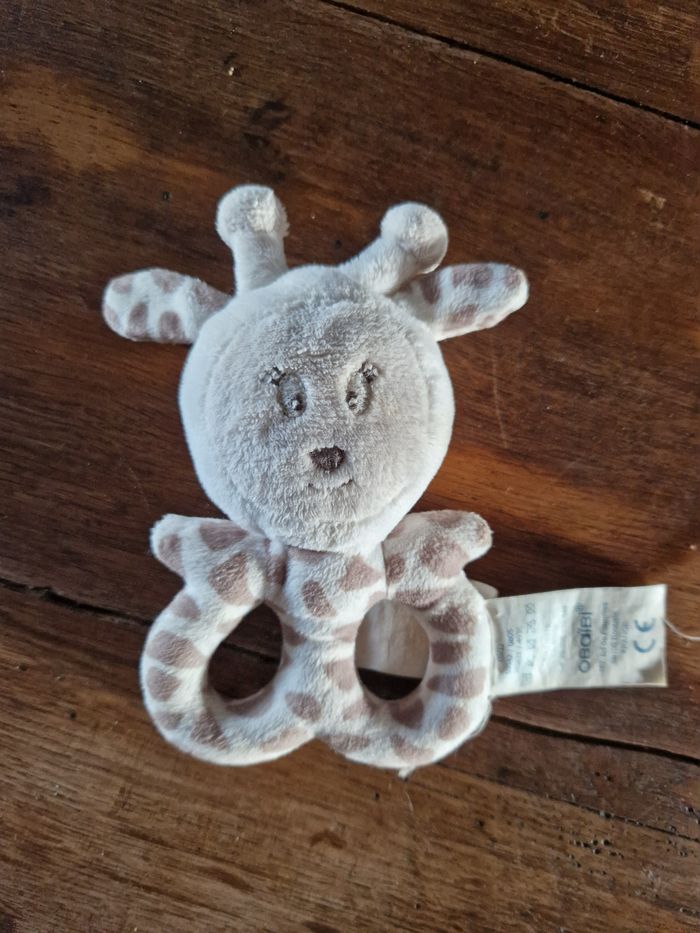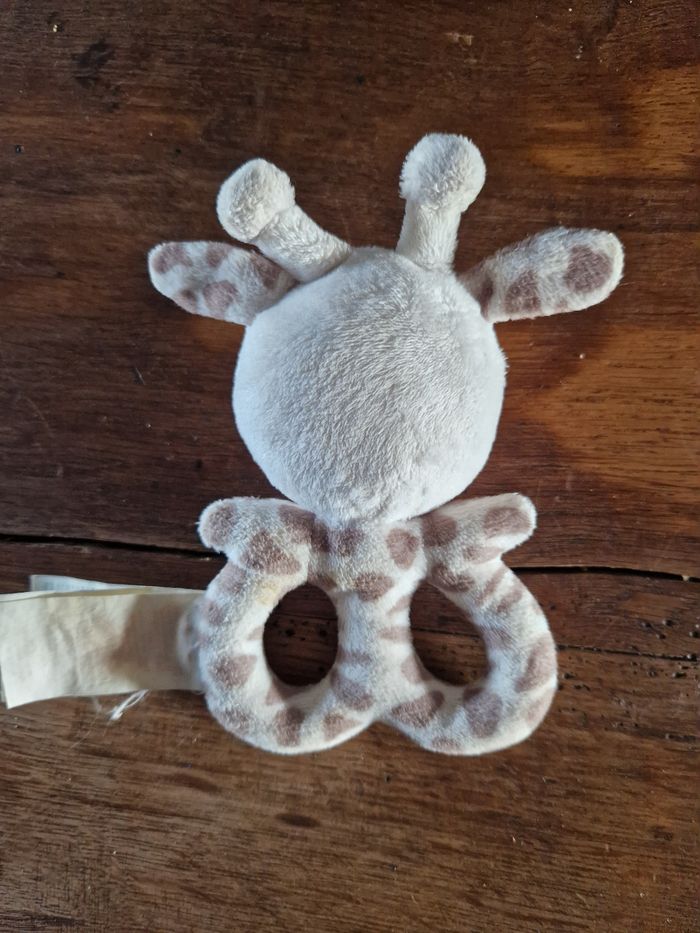 Hochet girafe tout doux de 16cm de haut, une bille a l'intérieur qui fait du bruit quand on le secoue