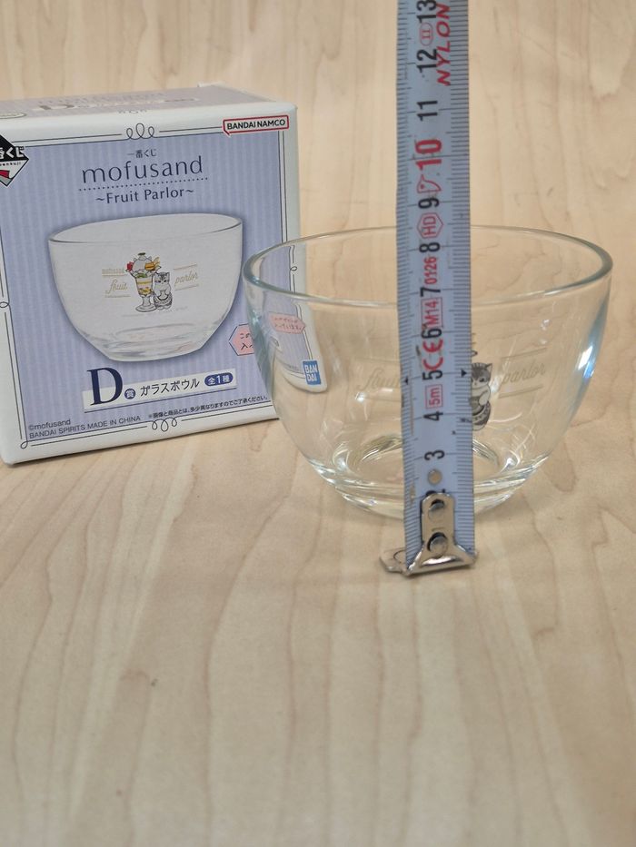 Coupelle en verre Mofusand Ichibankuji "Fruit Parlor". Verre, environ 6.5 cm de haut pour 10 cm de diamètre. En excellent état avec sa boîte d'origine en état correct. Vendeur habitué aux envois fragiles. 🌸Les prix sont fixes, car ils intègrent les taxes auxquels les pros sont asujettis. Aucune offre ne sera acceptée qu'il s'agisse d'un lot ou d'un article à l'unité, merci. 🌸N'hésitez pas à vérifier la disponibilité de l'article avant de procéder à l'achat.