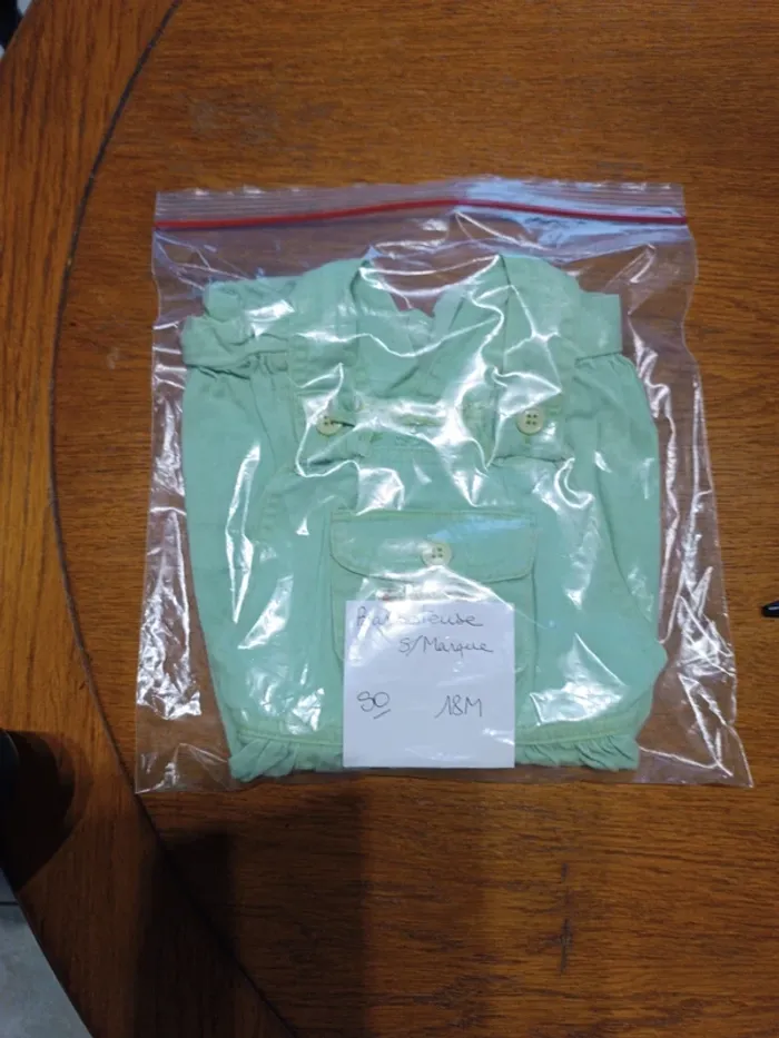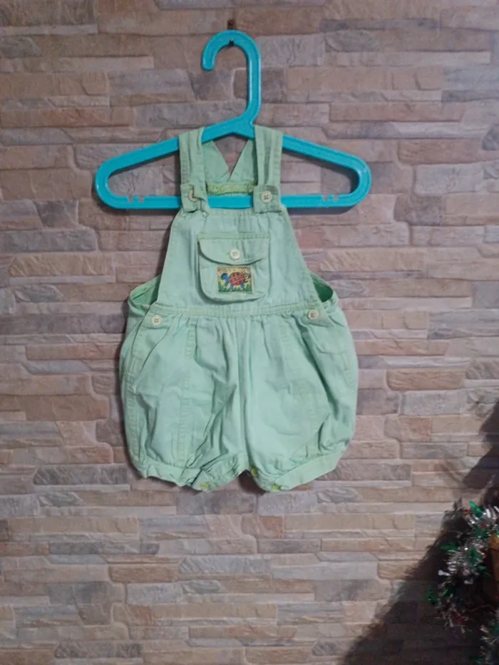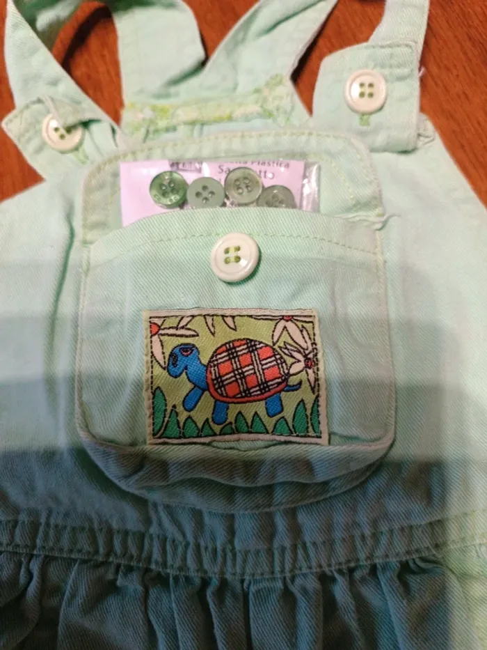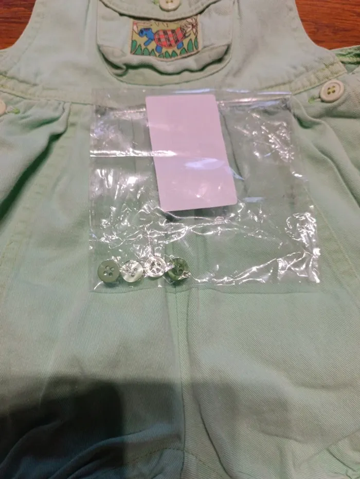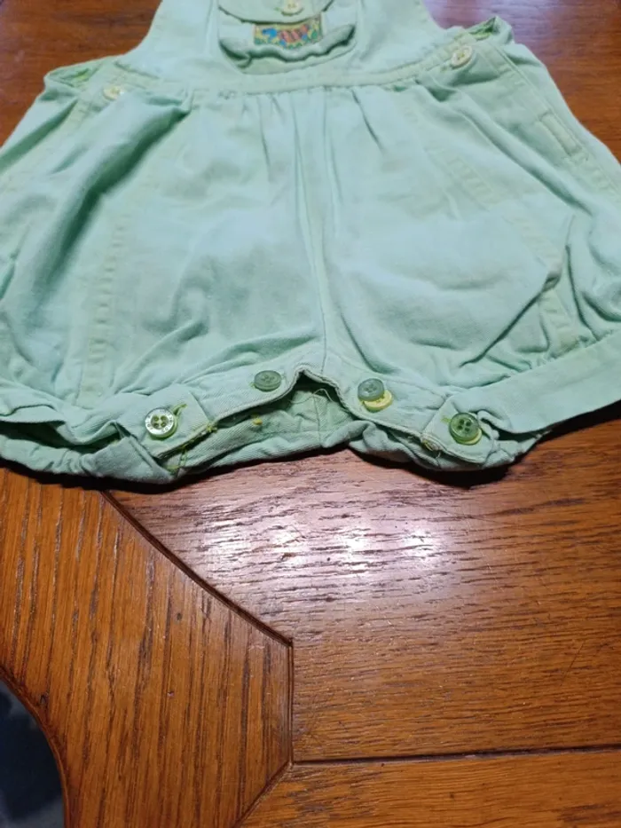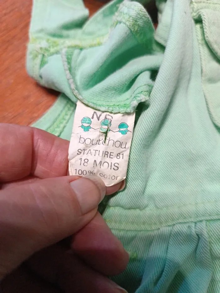 Barboteuse jean vert menthe Bout'chou 18M. Sans marque. 100% coton. Manque 1 bouton entrejambe remplacé par 4 boutons verts à changer dans la poche. TBE