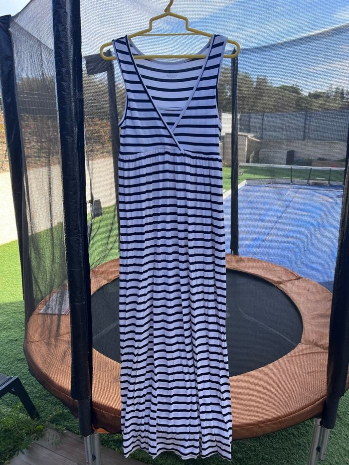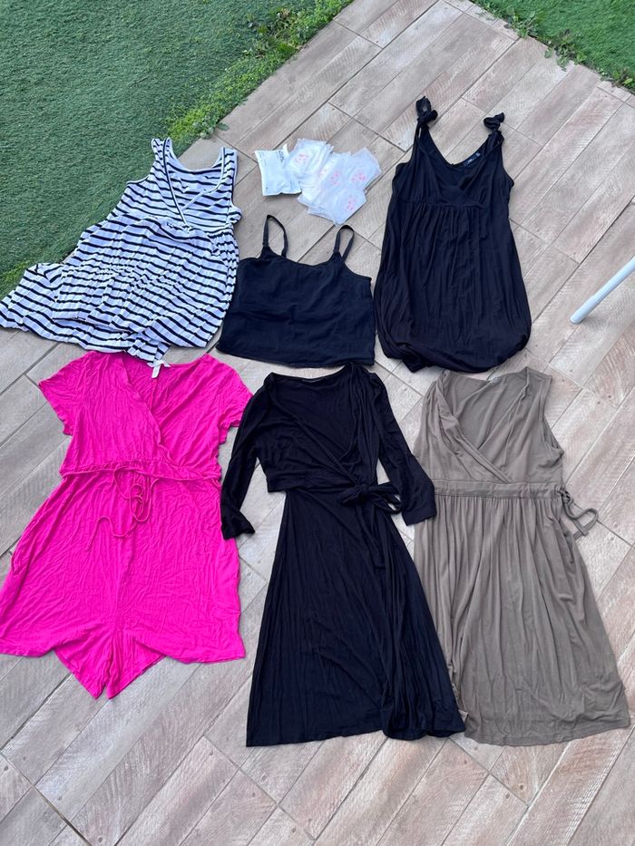 Lot de vêtement de grossesse et d’allaitement + coussinets d’allaitement neufs peut être vendu séparément Taille s : robe marinière premaman et robe noire manche 3/4 kiabi Taille m : combi rose h&m, top d’allaitement kiabi , robe kaki premaman et robe noire kiabi
