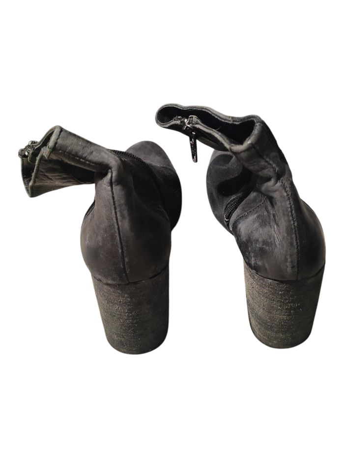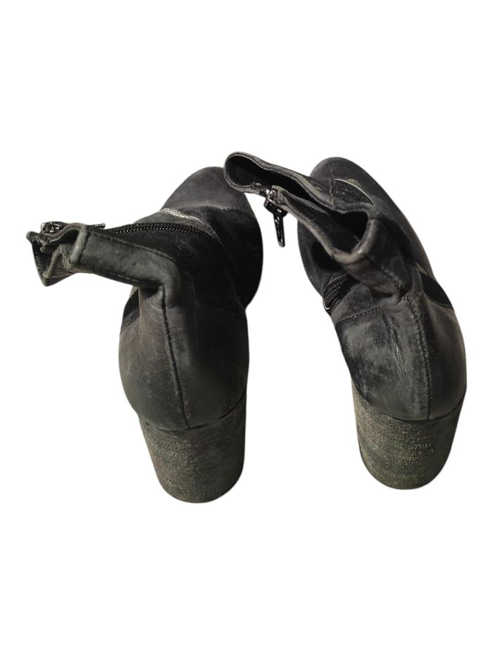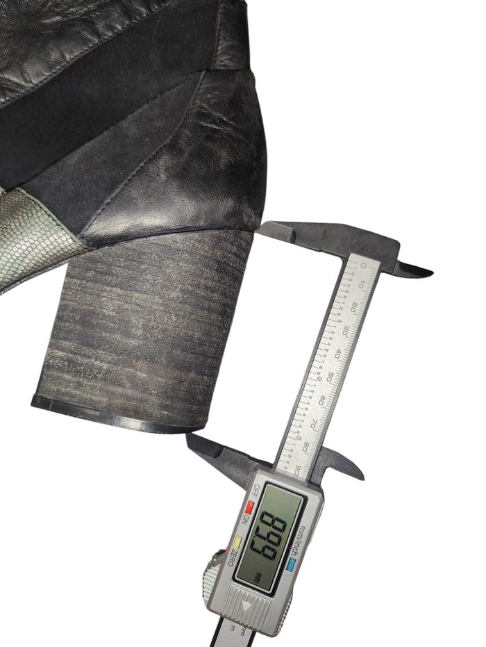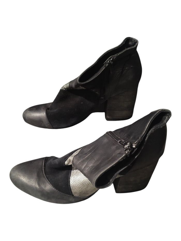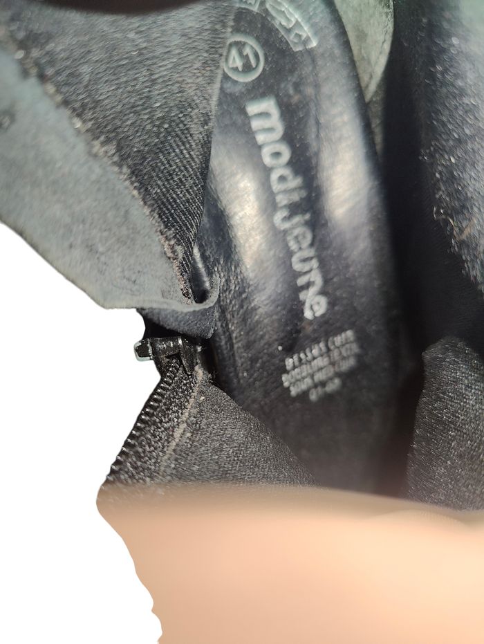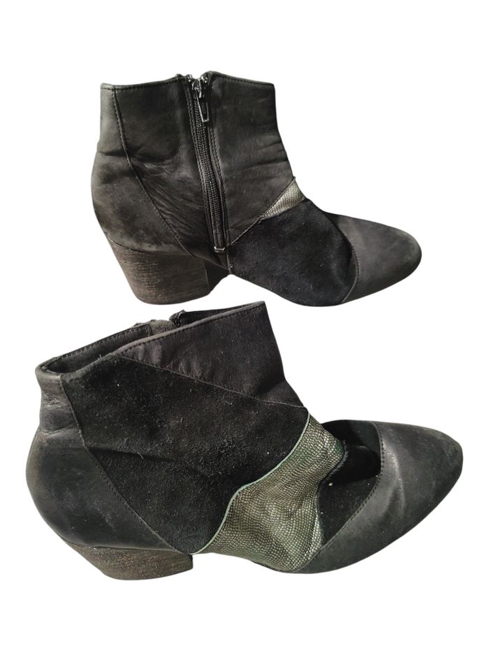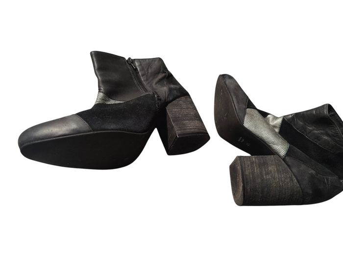Paire de bottines de la marque Modi Jeune, au style affirmé et original. Elles se distinguent par un savant mélange de textures et un look "créateur". Matières : Empiècements en cuir lisse noir, daim (suédine) et une bande centrale texturée effet écailles/serpent avec des reflets métallisés. Qualité : Dessus en cuir et sous-pied (semelle intérieure) en cuir pour un meilleur confort et une bonne respirabilité. Doublure textile. Talon : Talon bloc stable d'environ 9 cm, avec un aspect brut/strié très moderne. Fermeture : Zip latéral intérieur pour un enfilage facile. État : Bon état général. Le cuir est souple et bien entretenu. Le style est volontairement un peu "vintage/distressed". Guide des tailles : FR : 41 UK : 7.5 US (Femme) : 9.5 - 10