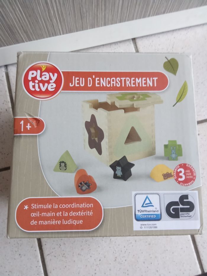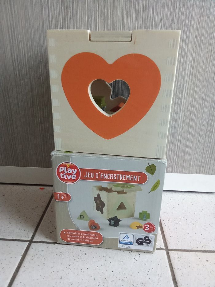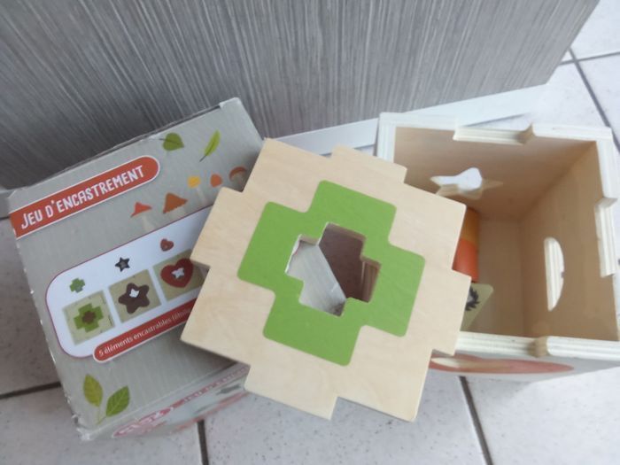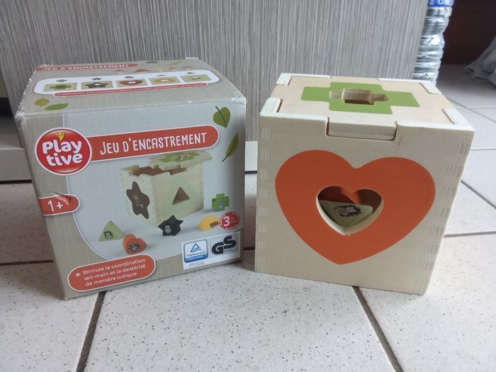 Boîte à forme en bois avec sa boîte d'origine. Complet, boîte mesurant 14x14 cm Bon état général. De nombreux autres jeux en bois également à vendre ds mon dressing et réduction activée