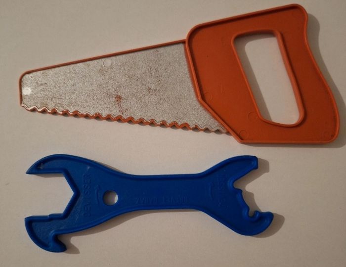 Lot de 7 petits outils en plastique pour votre petit bricoleur. Longueur de la scie par exemple :17 cm.