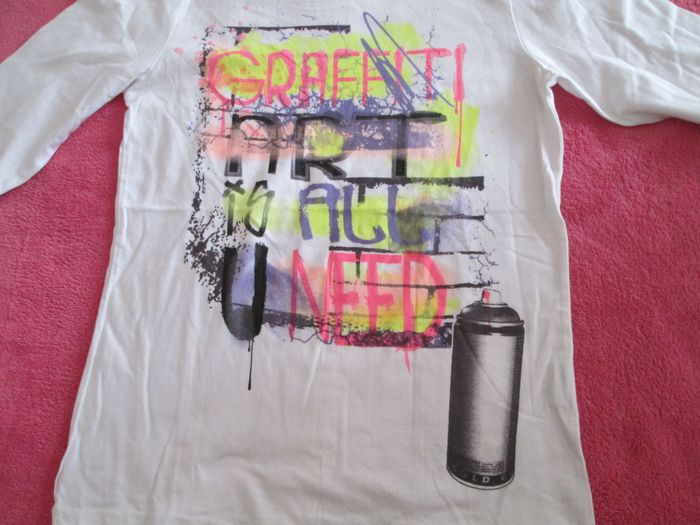 Vends tee-shirt imprimé fille. Motif Street Art. 100 % coton. Taille 14 ans. Très bon état. N'hésitez pas à consulter mes autres annonces.