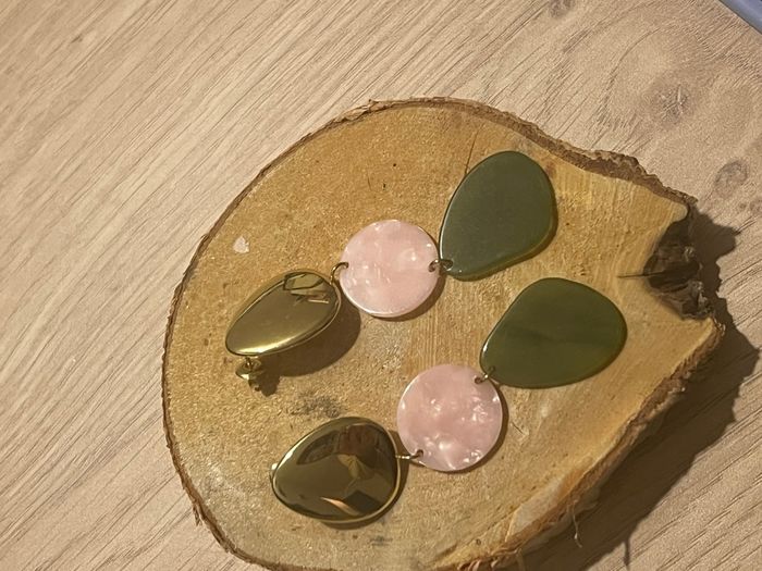 Jolies boucles d’oreilles Victoria Très peu portées En acier doré avec pierre rose nacré et vert kaki Avec certificat de garantie et sachet