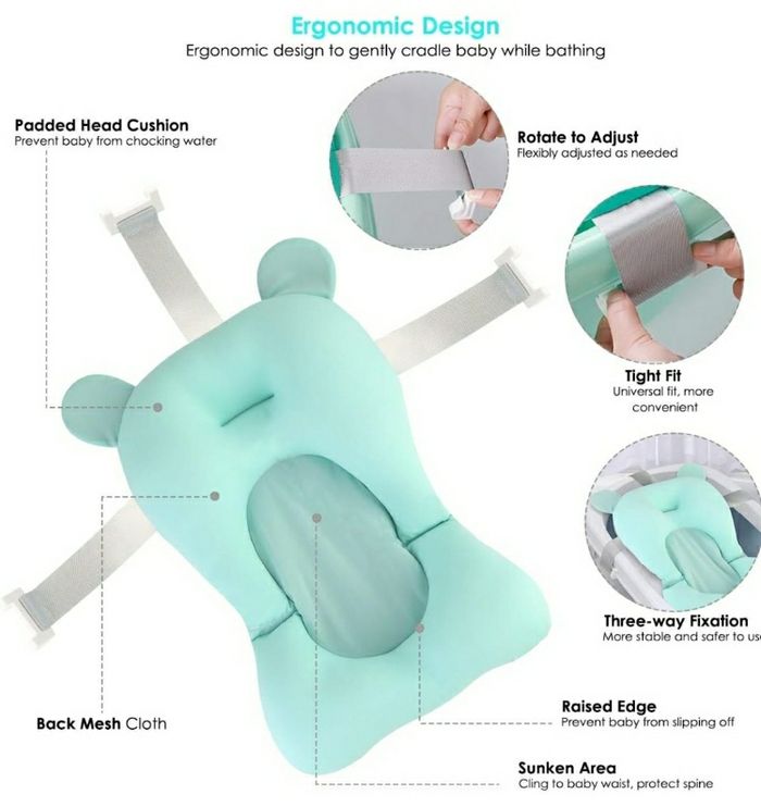 *La tête est surélevée pour empêcher l'eau de pénétrer dans les oreilles de bébé. *Profondément profilé pour bercer bébé en toute sécurité pendant le bain. Taille : 34X51CM . *Se plie de manière compacte pour le stockage et le voyage. Le rembourrage doux sèche rapidement avec un cintre robuste pour un rangement pratique au sec. *Confortable, résistant à la moisissure, antidérapant, sans PBA, sans fuite. Application du produit : 0-6 mois. *Pour les nourrissons de 0 mois à s'asseoir sans aide. Bébé appréciera de ne pas avoir à s'allonger dans une baignoire en plastique dur. Jamais [URL masquée pour votre sécurité] se clipse sur le bord de baignoire bébé, pliante ou pas,grâce à ces pinces...un bonheur pour flotter comme nous qd on bulle a la mer...