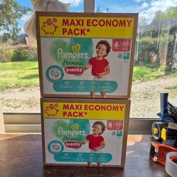 Code -15€ : BONNET25 Jusqu’au : 17/01/2026 Lot : 2 cartons neufs. Variété : Pampers Harmonie en PANTS. Taille 6 : Bébé 15+ kg Quantité : 120 (2*60) couches PANTS #couche #pampers #couchepampers #coucheharmonie #harmonie #premiumprotection #babydry #couchetaille6