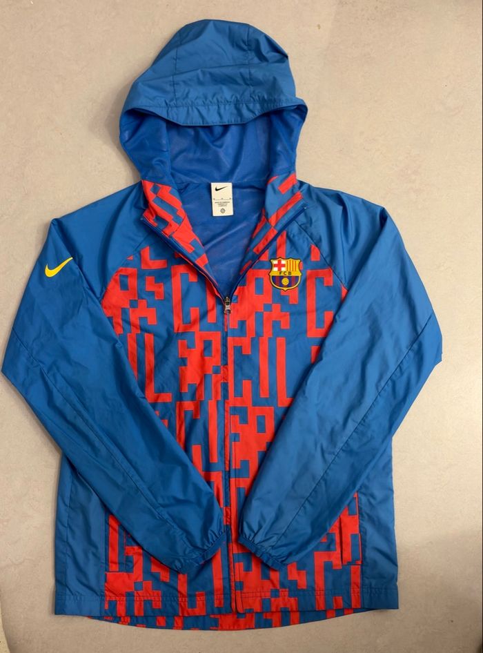 Veste Nike FC Barcelone Officielle (époque Nike × Barça) Couleur bleu royal avec graphismes rouges pixelisés Logo FCB brodé sur la poitrine + swoosh Nike jaune sur la manche. Taille M, coupe sportive, légère et confortable. Idéale pour le sport, le foot ou un look streetwear # État : très bon, propre, sans trou ni tache. Envoi rapide sous 48h + emballage soigné. 9 Article authentique Nike.