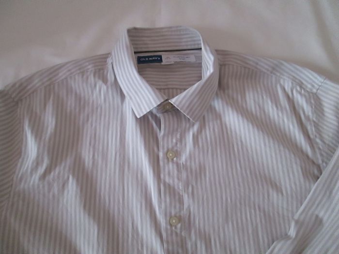 Vends chemise homme Old Navy rayée à manches longues. 67 % coton + 30 % polyester + 3 % élasthanne. Taille XL. Neuve, jamais portée. N'hésitez pas à consulter mes autres annonces.