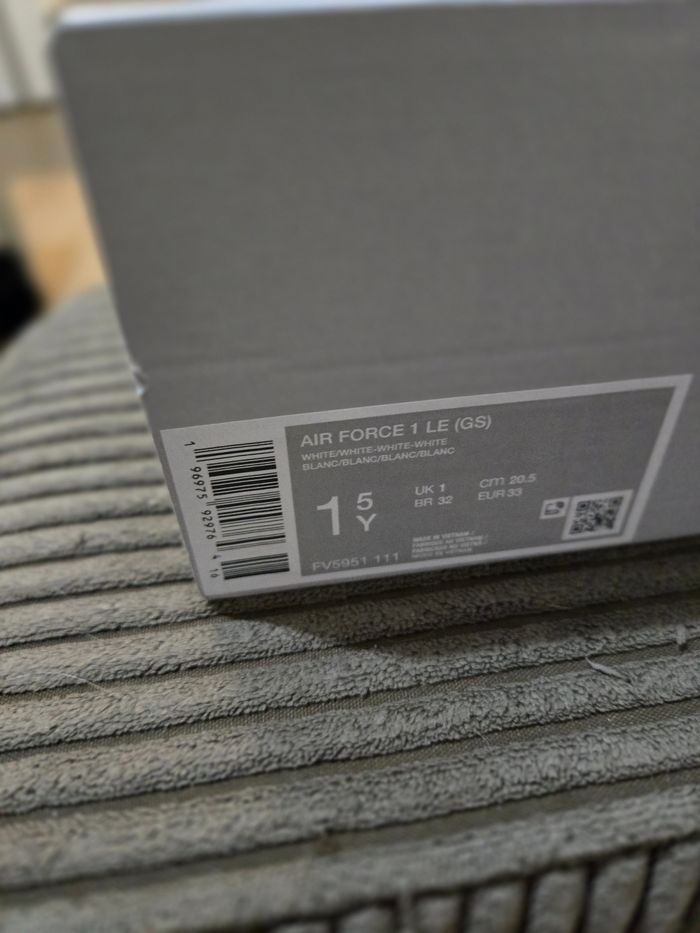 Nike Air Force 1 Neuves, jamais portées. Taille : 33 Coloris : blanc. État impeccable, aucun défaut. Vendues avec la boîte d’origine sans couvercle. Modèle iconique, confortable et résistant, idéal pour enfant. Nike Air Force 1 enfant 33, AF1 blanc, sneakers Nike neuves, chaussures basses iconiques, boîte d’origine