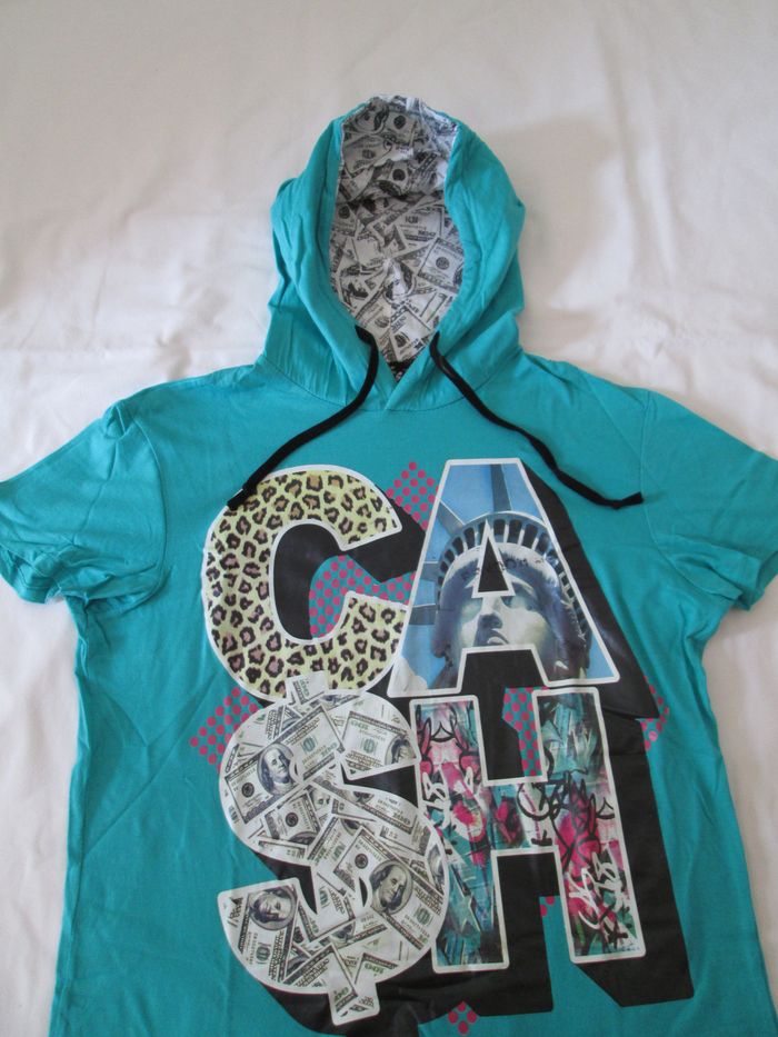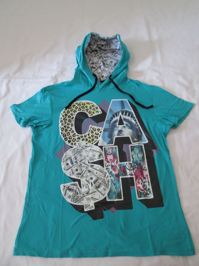Vend tee-shirt bleu à capuche avec impression. 100 % coton. Taille S. Très bon état. N'hésitez pas à consulter mes autres annonces.