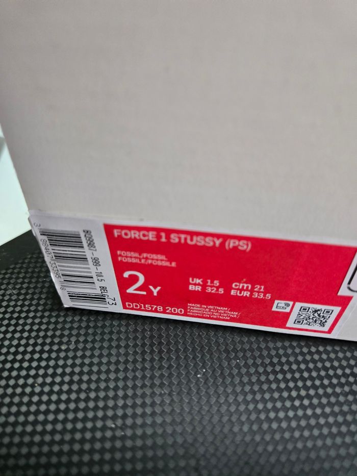 Nike Air Force 1 Stüssy – Taille 33,5 Neuves, jamais portées. Taille : 33,5. Coloris : beige crème. État impeccable, aucun défaut. Vendues avec la boîte d’origine sans couvercle. Collaboration Nike x Stüssy, modèle rare et très recherché, au style premium.