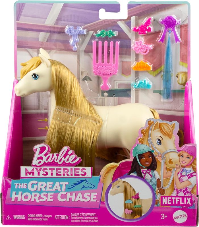 Barbie – LES MYSTÈRES DE BARBIE - À la Poursuite du Cheval Perdu, Poney et accessoires Crinière très longue à coiffer (les styles peuvent varier), HXJ36 Lancez-vous dans la course avec ces poneys inspirés de la série Netflix, Barbie Mysteries : The Great Horse Chase ! Choisissez entre Tornado et Pepper, les meilleures amies poney de la Barbie « Malibu » et la Barbie « Brooklyn ».(coffrets vendus séparément, certains produits peuvent ne pas être commercialisés). Chaque cheval est fourni avec un peigne, une extension de crinière et 6 barrettes pour s’amuser à coiffer sa crinière et sa queue très longues !​ Les enfants (à partir de 3 ans) peuvent laisser libre cours à leur imagination avec Barbie ! Poupée non incluse. Les fans peuvent collectionner toutes les poupées et tous les jouets pour recréer des scènes et inventer de nouvelles aventures !