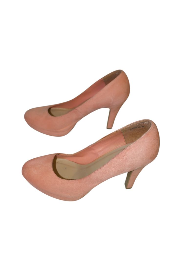 Pointure : 42 français / 8 UK Hauteur talon : 12 cm / 4,7 inches Plateau : 2 cm Coupe : Wide Fit Matière : daim synthétique Couleur : rose poudré/nude rosé Marque : New Look Style : escarpins glamour, chaussures à talon, pumps plateau Superbes escarpins femme en daim rose poudré de la marque New Look coupe Wide Fit, parfaits pour toutes vos occasions glamour ! Le talon aiguille de 12 centimètres (4,7 pouces) avec plateau avant de 2 centimètres apporte une hauteur spectaculaire pour sublimer vos jambes tout en conservant une stabilité optimale grâce au plateau généreux qui réduit considérablement l'inclinaison du pied. La couleur rose poudré nude s'harmonise à merveille avec toutes les carnations et se marie parfaitement aux tenues de soirée, cocktail, mariage ou événements spéciaux. Ces escarpins présentent un bout rond classique qui allonge le pied avec élégance, tandis que la coupe échancrée sur les côtés affine la silhouette. La coupe Wide Fit offre un confort optimal aux pieds plus larges sans compromettre l'élégance. La matière daim synthétique offre un rendu luxueux et une texture veloutée agréable au toucher. L'intérieur est doublé avec une semelle de confort rembourrée pour un port agréable même prolongé. Idéaux pour créer un look féminin, glamour ou festif, ces escarpins conviennent parfaitement aux occasions spéciales où vous voulez faire sensation. Ils se marient magnifiquement avec une robe de soirée, un ensemble chic, une combinaison élégante ou même un jean slim pour un effet casual-chic audacieux. La hauteur importante du talon avec plateau permet un port plus confortable qu'un talon classique de même hauteur. Portés mais en bon état, semelle extérieure en très bon excellent état. Talons en parfait état sans rayures. Ces chaussures vous accompagneront avec style pour tous vos événements les plus glamour.