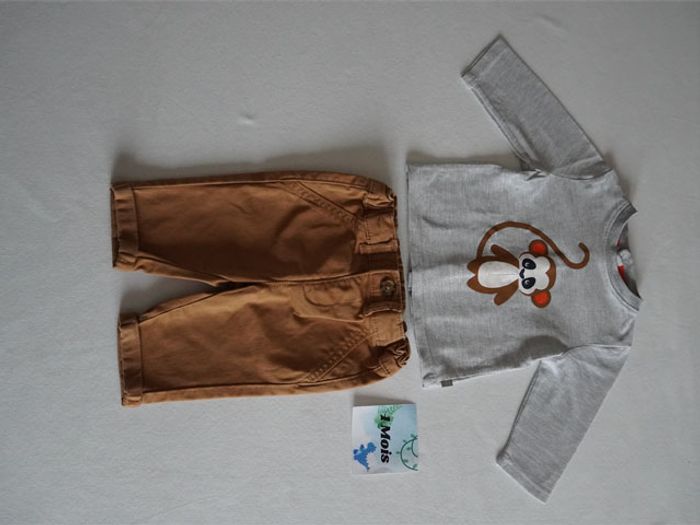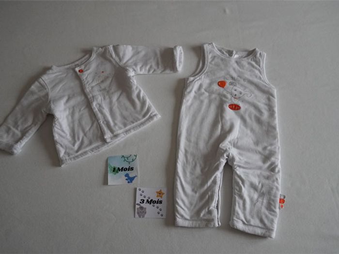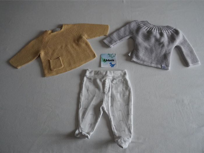 Articles restés en parfait état, sans tâches. Il y a : 1 ensemble matelassé réversible Tex 1/3 mois blanc fantaisie + 1 pantalon camel Kiabi + 1 Haut gris chiné clair fantaisie Obaibi + 1 combinaison marine/blanche fantaisie P'tit Bisou + 1 pantalon avec pieds blanc fantaisie Obaibi + 1 Haut en mailles jaune foncé Zara + 1 Brassière ou gilet en mailles gris/blanc MLT.