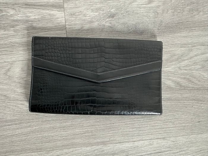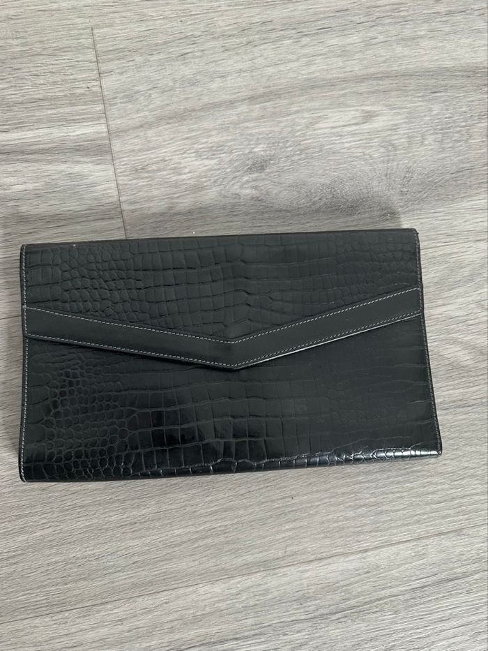 Pochette - Excellent état - Noire et dorée - Le Tanneur Paris - Fabrication française 🇫🇷 - En cuir véritable, effet python serpent - Anse amovible, chaîne dorée - Se ferme avec une pression - L’intérieur de la pochette est en lambeaux, morceaux: voir photos Dimensions: - 27cm de large - 16cm de haut - 96cm de long pour la chaîne