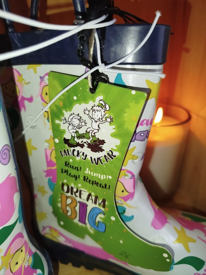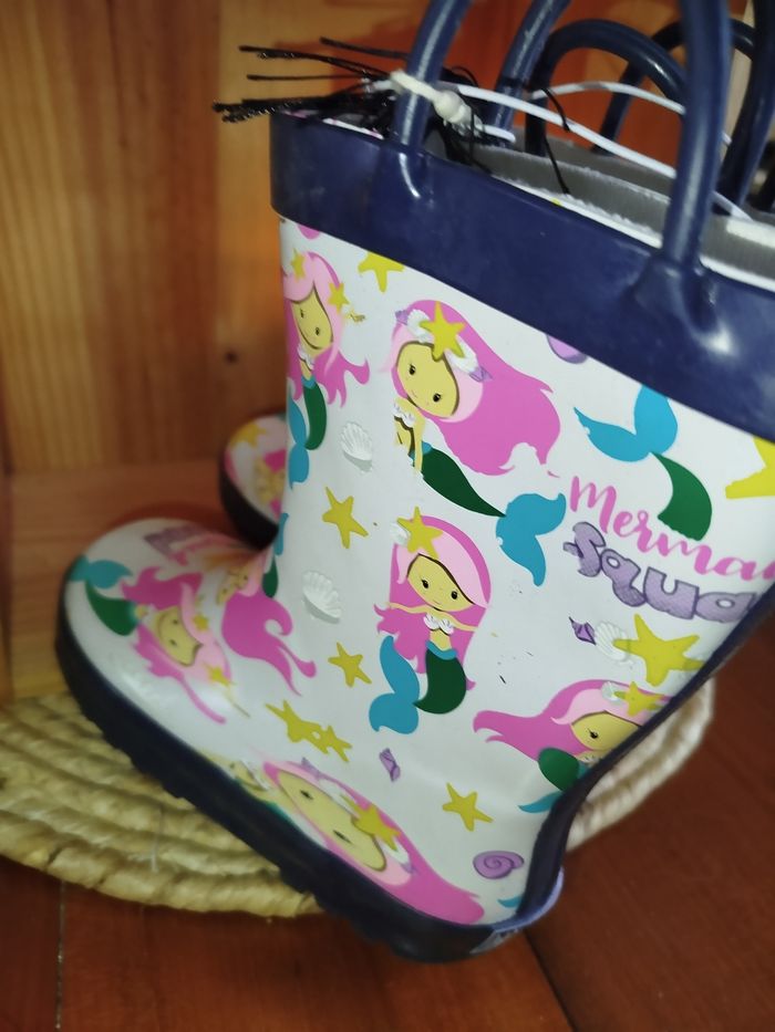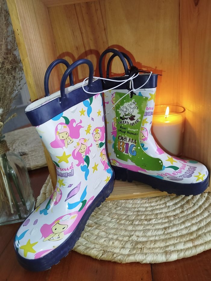 🌊 BOTTES DE PLUIE SIRÈNES MAGIQUES 🧜‍♀️✨ Attention… ces bottes transforment chaque flaque en océan enchanté 🐚💦 Parfaites pour les petites sirènes (ou sirènes en herbe) qui n’ont pas peur de la pluie ! 👢 Marque : Mucky Wear 📏 Taille : 26 ✨ État : Neuf, jamais porté (elles n’ont encore jamais nagé dans une flaque !) 👐 Faciles à enfiler grâce aux poignées pratiques – autonomie garantie 💰 Prix magasin : 34,99 € 💥 Prix de vente : 15 € Motifs adorables de sirènes, bottes solides et confortables : idéales pour affronter la pluie avec le sourire 🌈 👉 La pluie n’a qu’à bien se tenir !