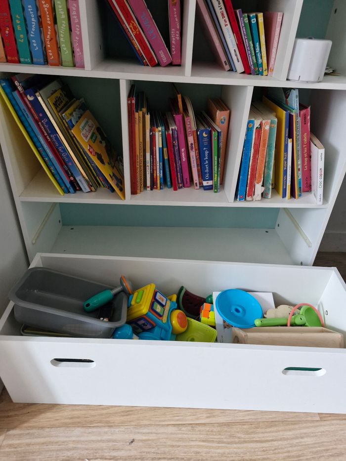 Meuble peux contenir une trentaine de livres voir plus. Tiroir intégrer pour ranger les jouets Ne prend pas beaucoup de place même dans une petite chambre Très bonne état