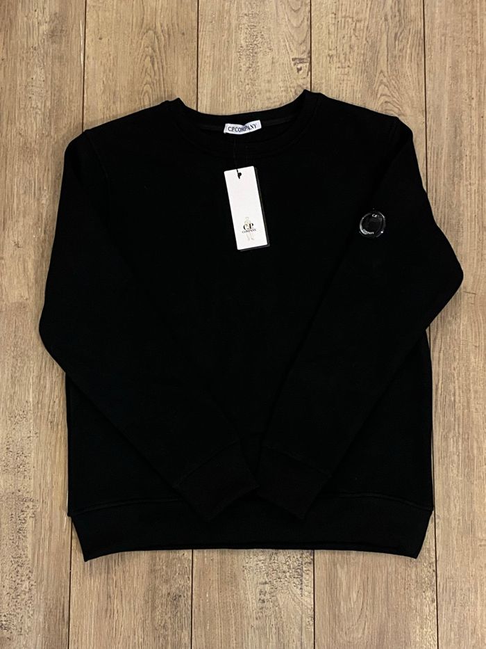 Pull sweat-shirt noir C.P. Company taille S. Coupe droite Aspect uni Col rond Manches longues Col, poignets et ourlet côtelés Badge et poche sur la manche. Doublé de polaire pour l’hiver. Longueur : 65 cm Largeur entre les aisselles : 54 cm