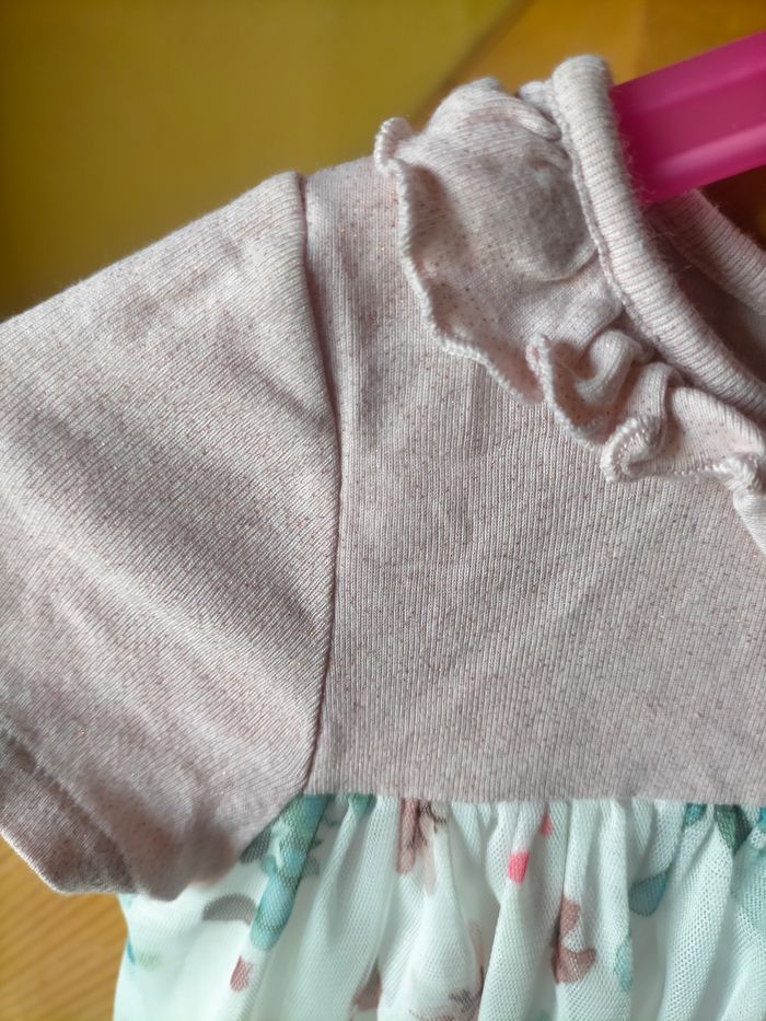Comme neuve, porté une fois. Superbe robe à manches courtes avec haut en jersey de coton rose pailleté, volant au col et base en tulle blanc imprimé fleuri. Toute doublée de jersey de coton, pressions au dos. Idéale pour une cérémonie ou une occasion habillée