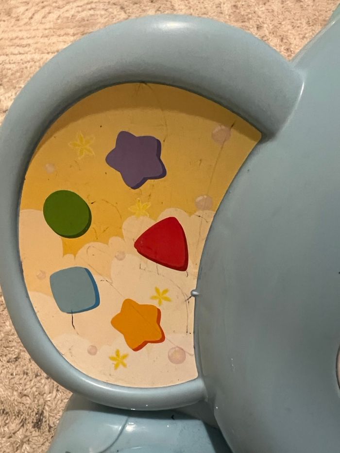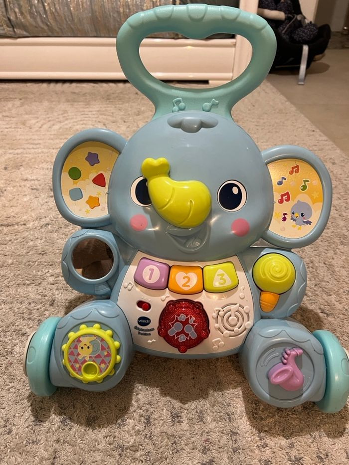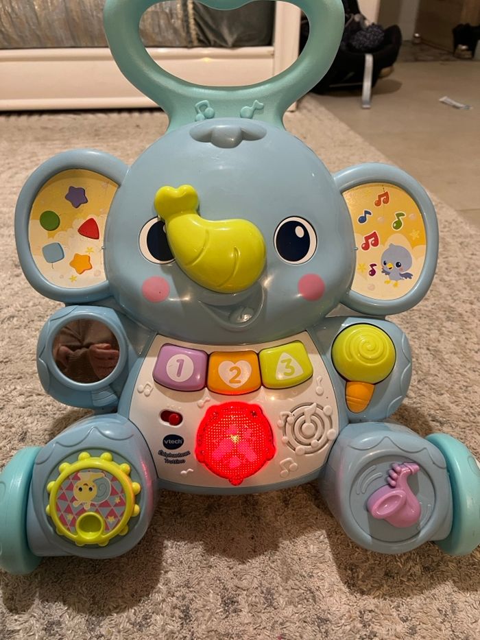 Trotteur de la marque Vtech en bon état, toutes les touches et musiques fonctionnent parfaitement. Petit gribouillage sur l’oreille gauche.