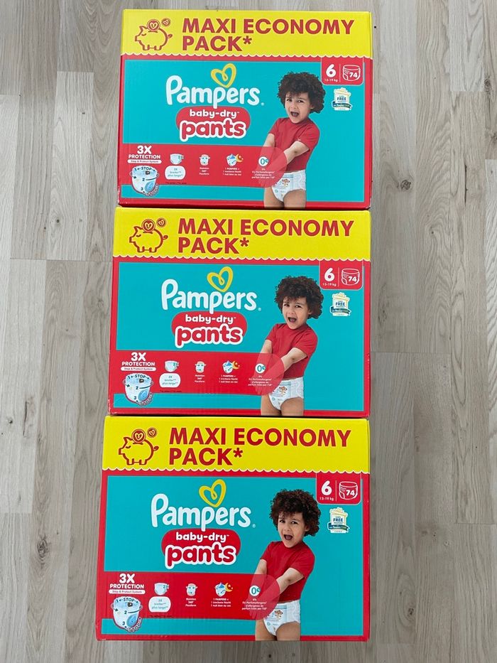Bonjour 3 cartons de Pampers pants taille 6 format maxi economy pack 3x74 couches soit 222 couches au total